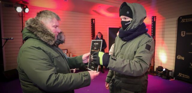 Rapp (vasakul) Pärnu Postimehe spordireporterilt Märt Pilmelt aasta sporditeo trofeed saamas (FOTO: Ants Liigus)